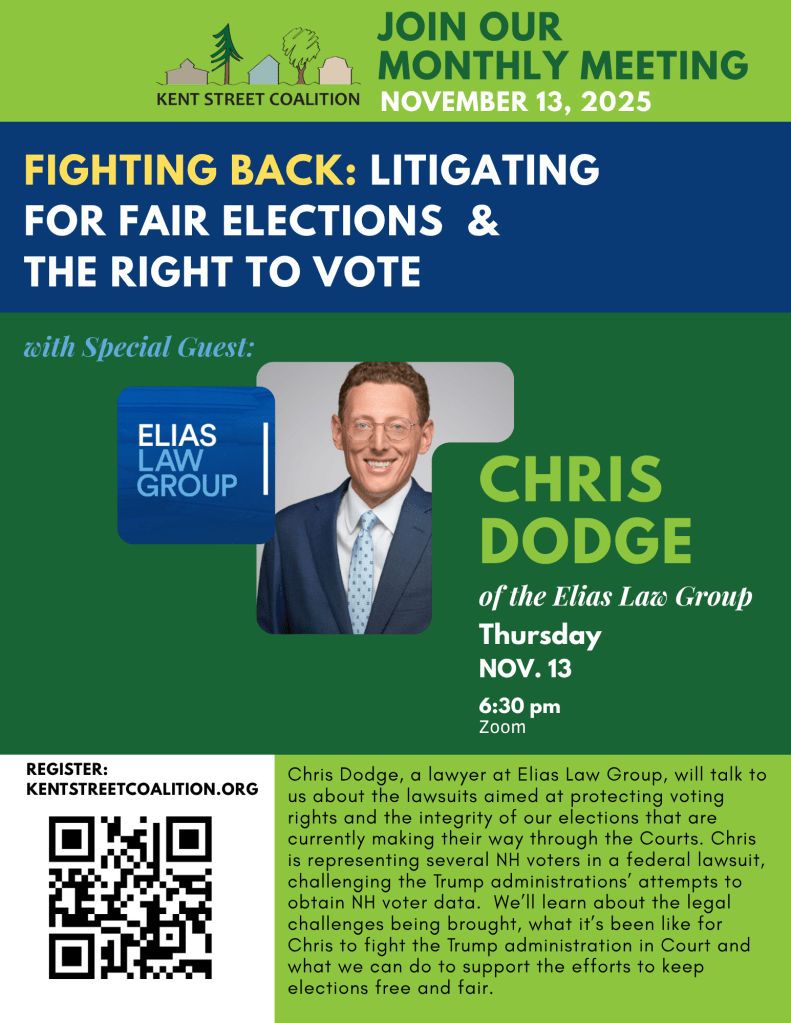 Now we get to hear from one of the Elias Group’s own attorneys who has been involved in several New Hampshire-based lawsuits. Chris will join Kent Street’s Kimberly Kirkland for a conversation about lawsuits currently making their way through the Courts where voting rights and the integrity of our elections are at stake. In one of these suits, Chris is representing several NH voters in a federal lawsuit challenging the Trump administration’s attempts to obtain NH voter data.
