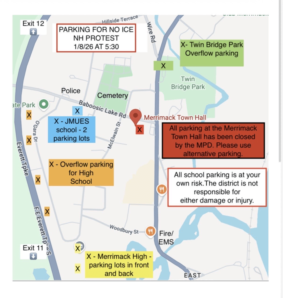1/8/2026: Parking Map Updated below, Merrimack Town Hall parking has been closed.
