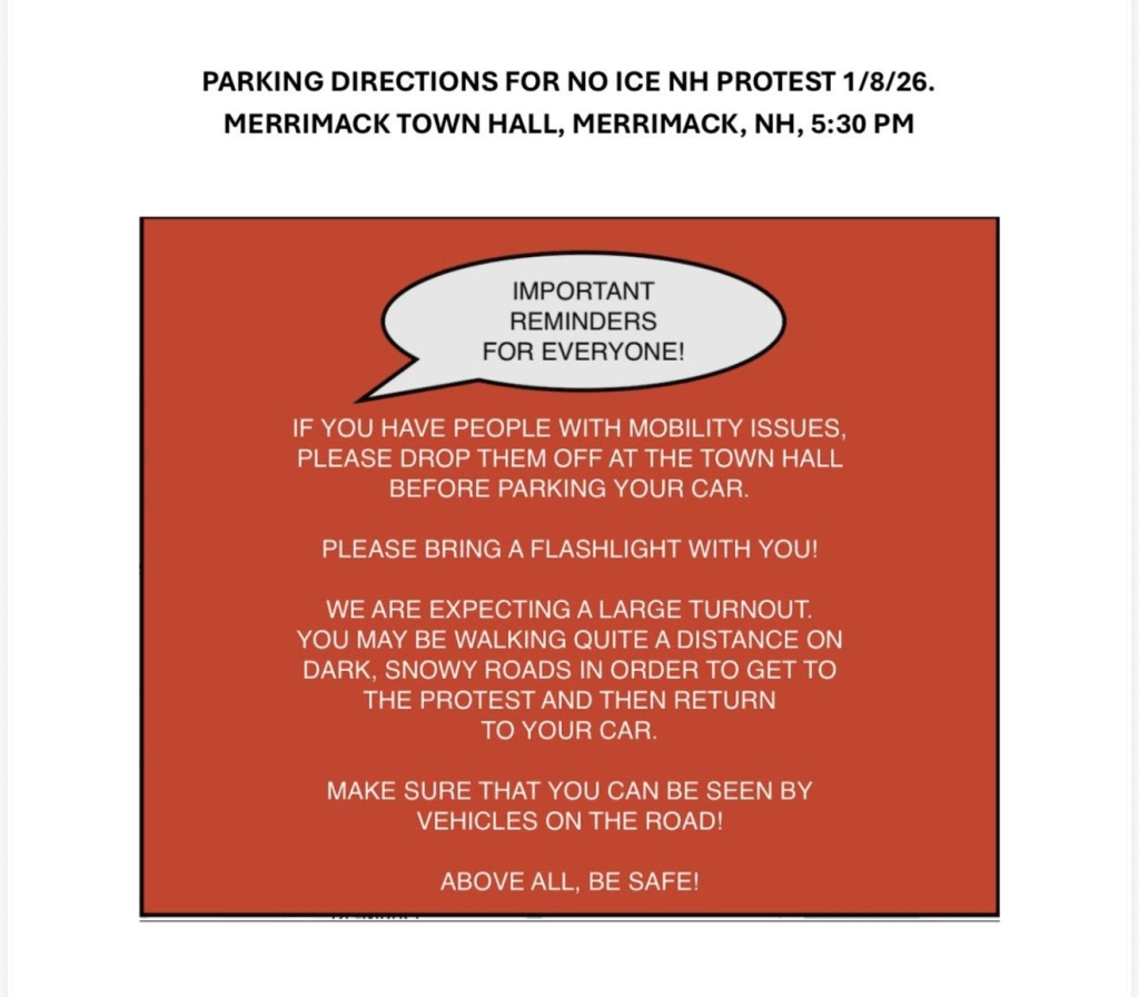 Kent Street Coalition is one of over 25 organizations sponsoring a peaceful protest organized by NO ICE NH. This non-violent event will be held this Thursday, January 8th outside the Merrimack Town Hall, from 5:30 till 7 pm. Those who wish can attend the town council meeting which begins at 7 pm.*
