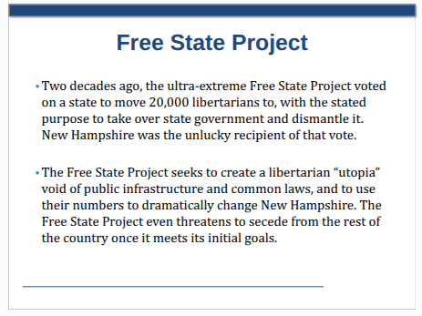 Learn about the Free State Project and the legislators implementing its goals in New Hampshire and share what you learn with friends, neighbors, and the community. View Bill Maddocks’ full presentation on the Free State Project here.