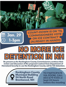 ICE is looking to lock in contracts with counties across NH allowing them to use county jails as detention centers. Rockingham Commissioners have expressed interest in entering into an agreement with ICE. They will be meeting to vote on whether to approve a contract on Thursday, January 29 at 1 pm at the Rockingham County…