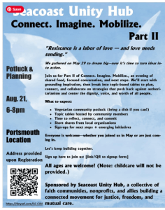 August 21 6 pm – 8 pm; Portsmouth Connect. Imagine. Mobilize – Part IISeacoast Unity Hub Join Seacoast Unity Hub for an evening of shared food and focused conversations to plan, connect, and collaborate on strategies to push back against authoritarianism and center the dignity, voice, and worth of all people.Register HERE.