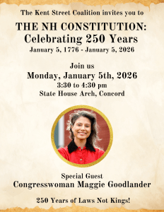 Monday January 5, Concord The Kent Street Coalition invites you to join Congresswoman Maggie Goodlander (NH-CD2) in celebrating the 250th Anniversary of the New Hampshire Constitution on Monday, January 5th in front of the State House Arch on Main Street in Concord from 3:30 to 4:30 pm. We will hear from Congresswoman Goodlander before reading…