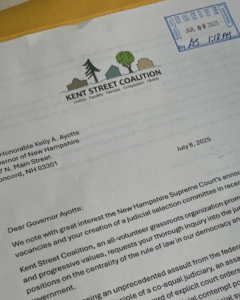 Kent Street Coalition wrote a letter to Governor Kelly Ayotte asking for her assurance that her Judicial Nominees would uphold the rule of law and hand-delivered it to her office. Download the full content of our letter here. Governor Ayotte is expected to soon nominate an individual to fill an upcoming vacancy on the NH…