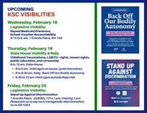 Wednesday, February 18 | 8:15–9:00 AM Temporary Legislative Offices, 1 Granite Place, Concord Stay left when parking; we’ll meet outside the lower door. Focus: Repeal Medicaid Premiums, School Voucher AccountabilityHold signs, support our Democratic legislators, and stand up for democracy. Signs and materials provided but feel free to bring your own. Thursday, February 19 |…