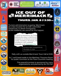 Thursday, January 8th, 5:30 pm, Merrimack Town Hall (6 Baboosic Lake Rd, Merrimack) 1/8/2026: Parking Map Updated below, Merrimack Town Hall parking has been closed. Dear Kent Street Friends, The Trump administration is eyeing the Town of Merrimack as a possible New Hampshire location for its planned network of ICE-controlled immigrant detention and “processing” warehouses.…