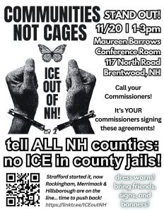 November 20, 2025 Communities Not Cages: ICE Out of NH 1pm-3pm 117 North Road, Brentwood NH Attend the County Commission meeting to speak out against a contract with ICE that would house immigration detainees in the county jail and/or assemble quietly to show concern.